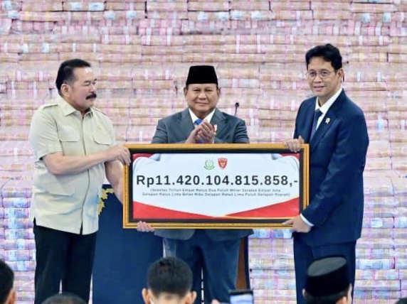 Dalam acara di Kejaksaan Agung, Jumat (10/4/2026), Presiden menyebut capaian tersebut setara hampir 10 persen dari total APBN. Ia menilai angka itu menunjukkan besarnya potensi kerugian negara sebelumnya akibat penguasaan aset secara tidak sah.