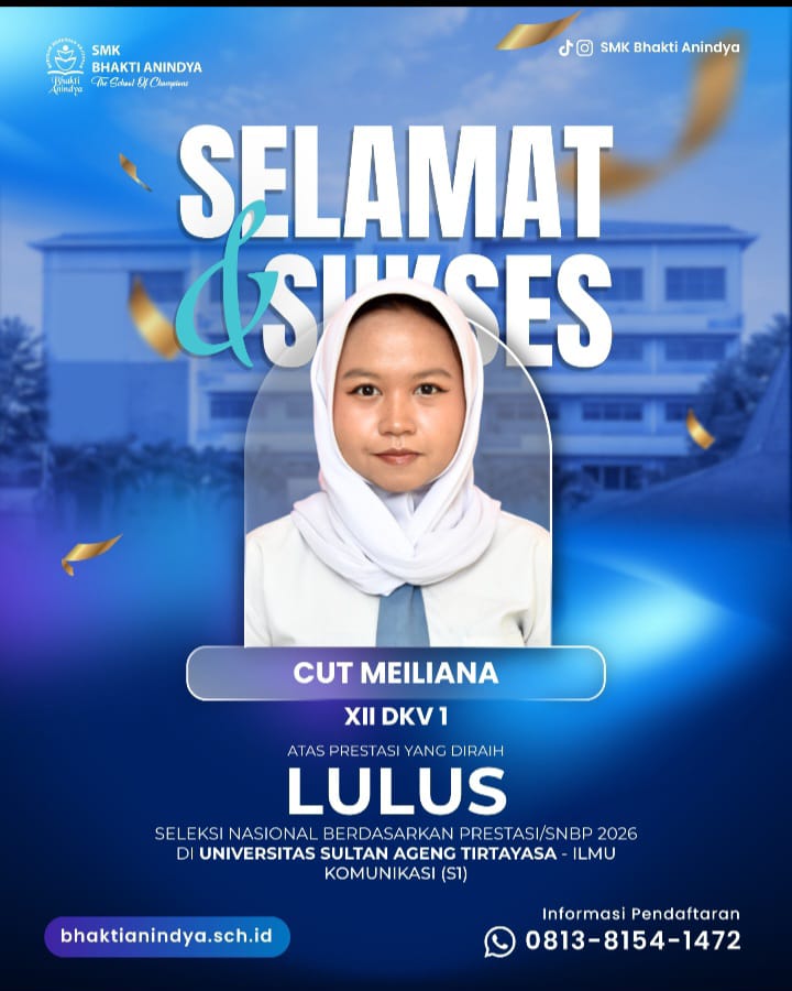 Salah satu kisah sukses datang dari Cut Meiliana, siswi SMK Bhakti Anindya jurusan Desain Komunikasi Visual (DKV), yang berhasil lolos seleksi nasional 2026 dan diterima di Universitas Sultan Ageng Tirtayasa pada jurusan Ilmu Komunikasi. Ia mengaku sangat bahagia atas pencapaiannya setelah melalui perjuangan panjang.
