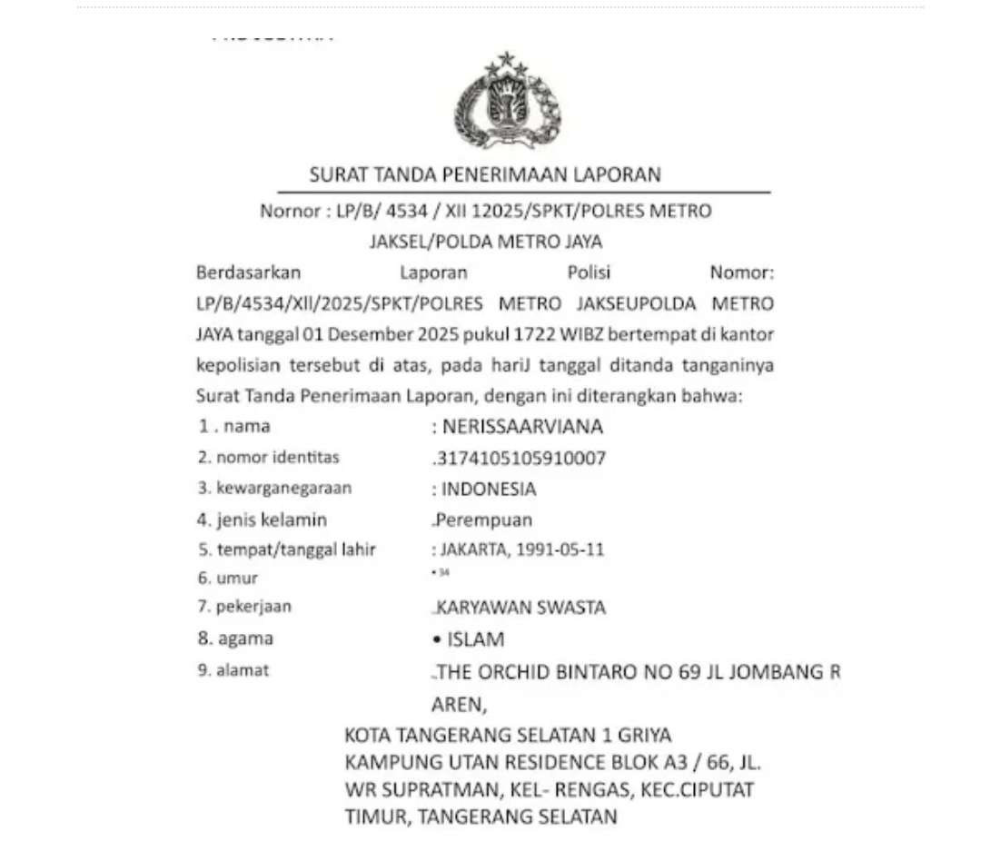Berdasarkan informasi yang dihimpun, laporan tersebut mencakup dugaan pelanggaran terkait penganiayaan, pengancaman, serta perbuatan tidak menyenangkan. Perkara ini tercatat dalam laporan polisi bernomor LP/B/4534/XII/2025/SPKT/POLRES JAKSEL/POLDA METRO JAYA tertanggal 1 Desember 2025.